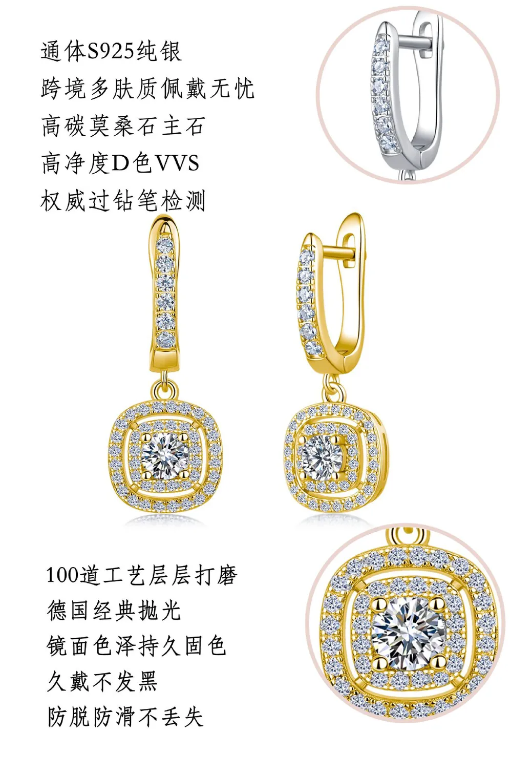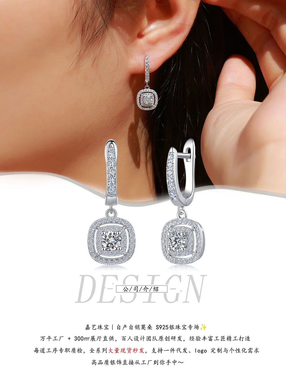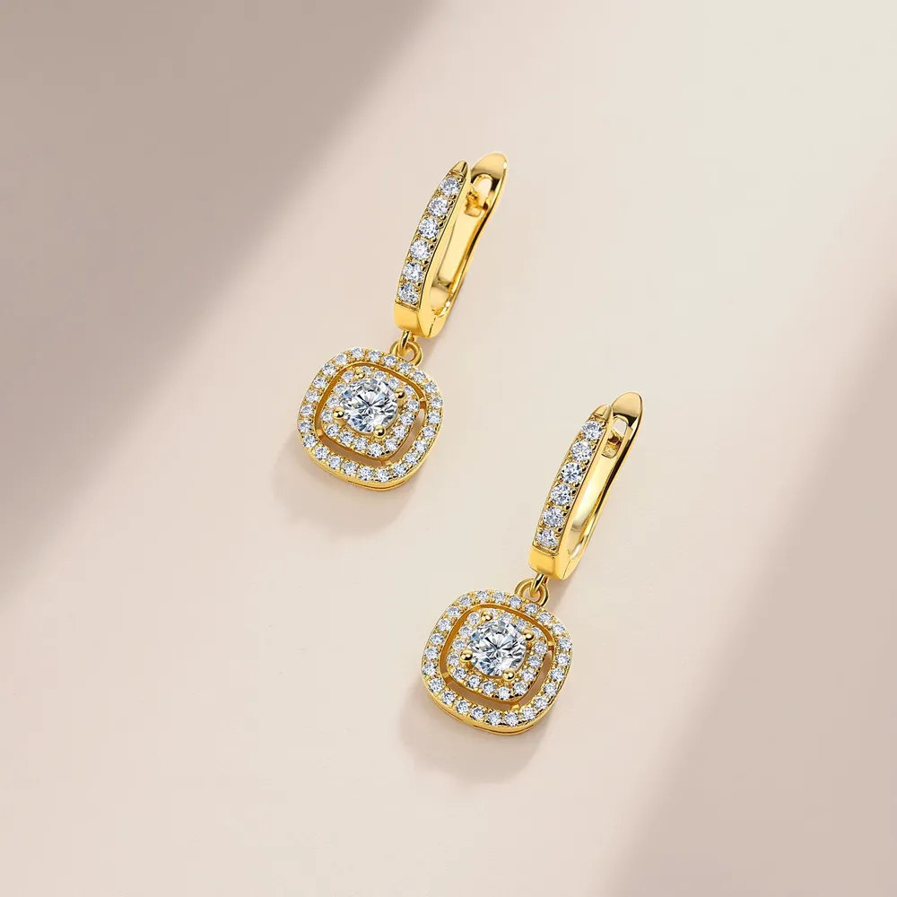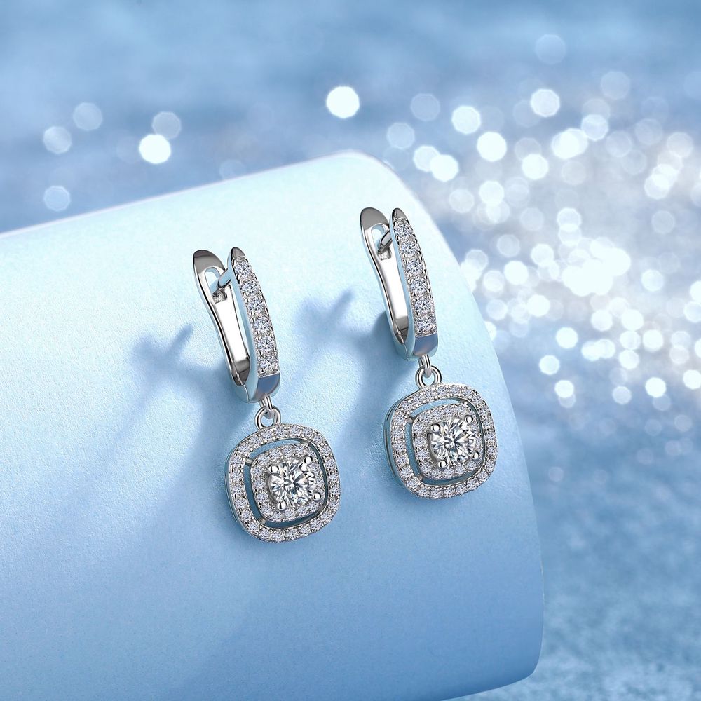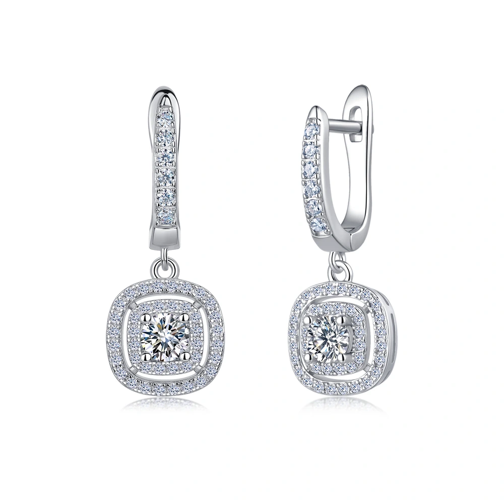 Wholesale 925 Silver Moissanite Square Drop Earrings, Premium Geometric Long Hoops with Box Snap Closure, Factory Direct Fine Craftsmanship Jewelry for Boutique Retail
